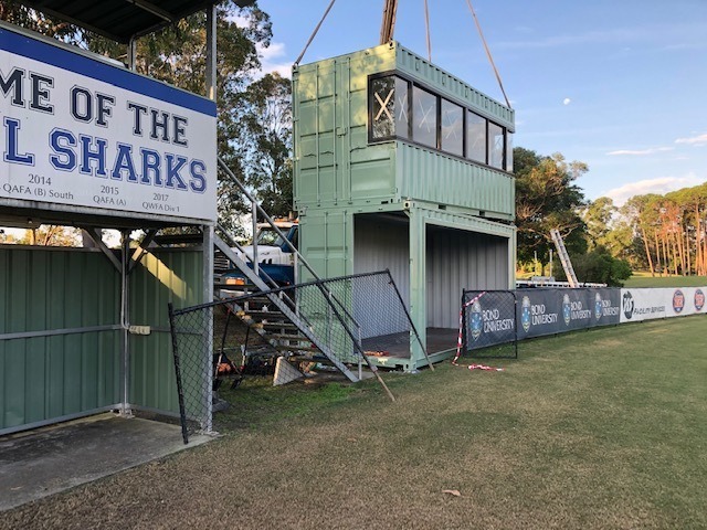 Using four new 20ft high cube containers, our team constructed two stacked structures complete with stairs, landing and awning. The bottom containers were designed as a players seating area, offering shade and shelter. These containers were secured to the ground using the Surefoot anchoring system provided by BMSA, with top containers locked in using twist locks.