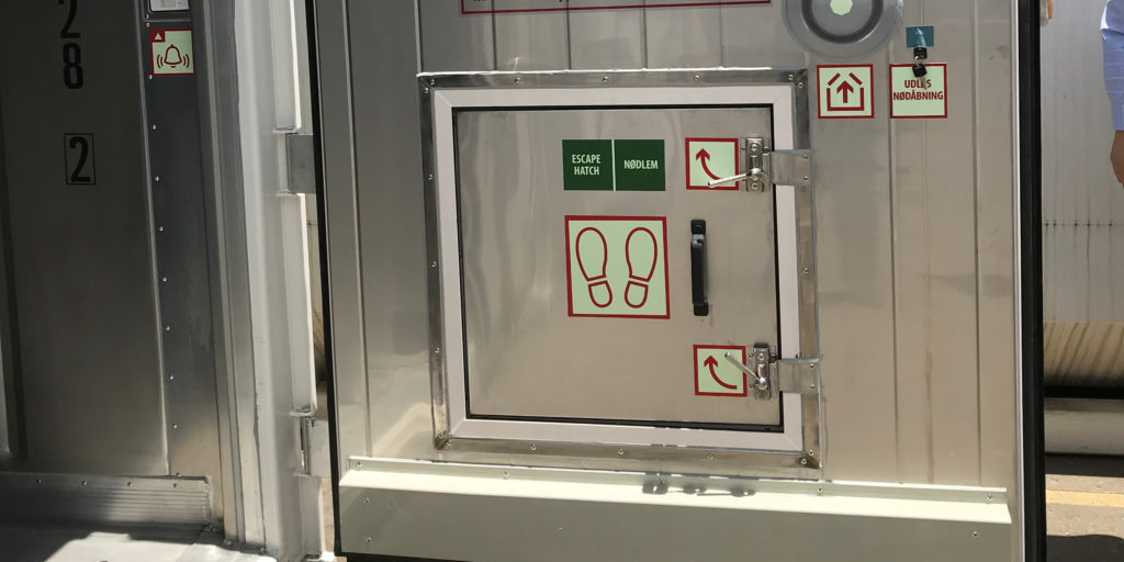 All internal safety, escape and ID signage is iridescent and clearly visible. This ensures that if there is a power failure, all personnel inside the unit can exit the refrigerated container safely.